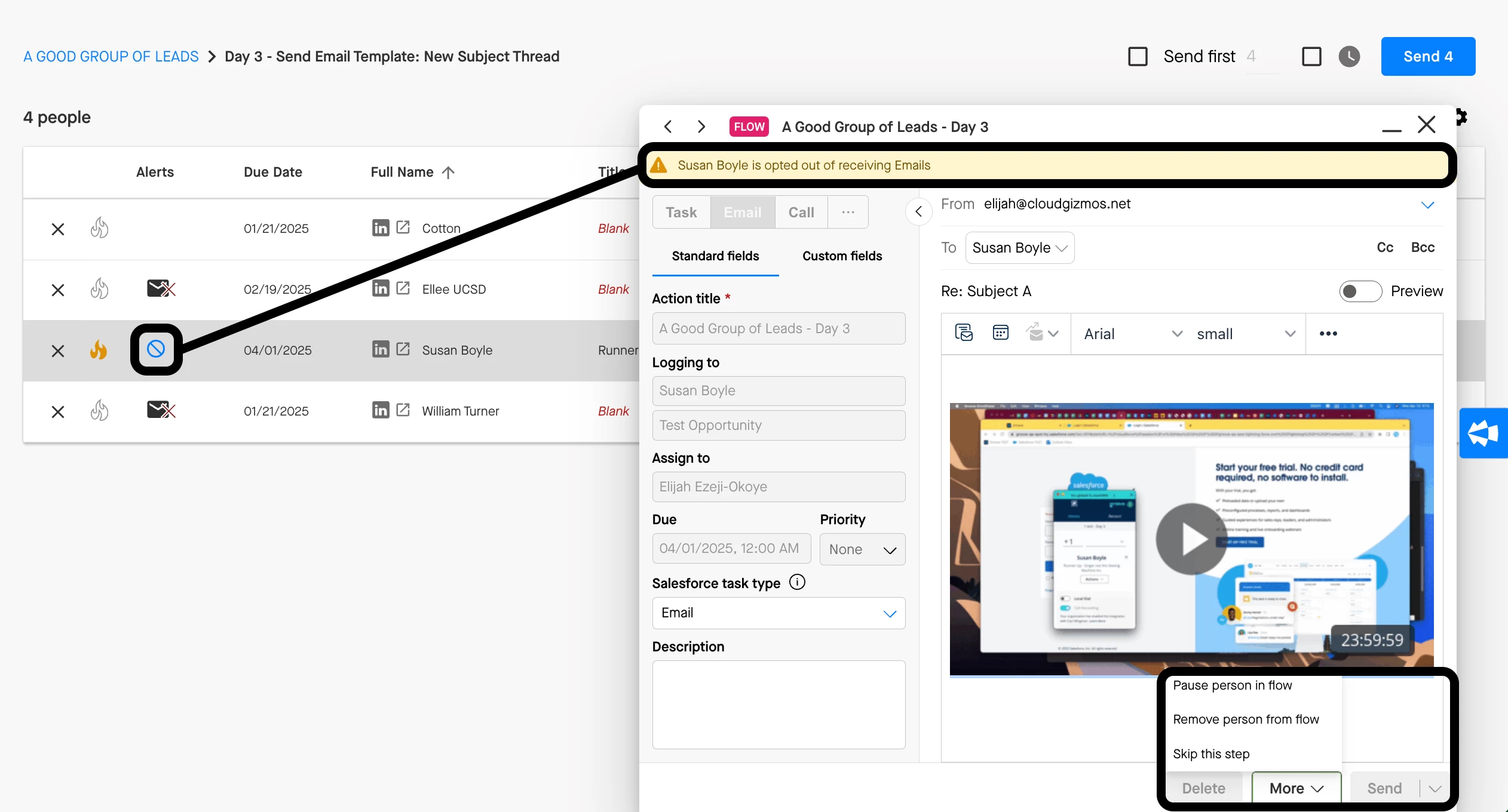 2. If a person opts out while in a Flow, you will see an error message if you attempt to execute the next email step in that Flow for them. The send button will also be grayed out, preventing you from sending another Flow email to them. If this happens, we recommend removing them from the Flow entirely by using the ‘X’ button to the left of their name, or skipping them through the email step by click ‘More’ > ‘Skip this Step’.