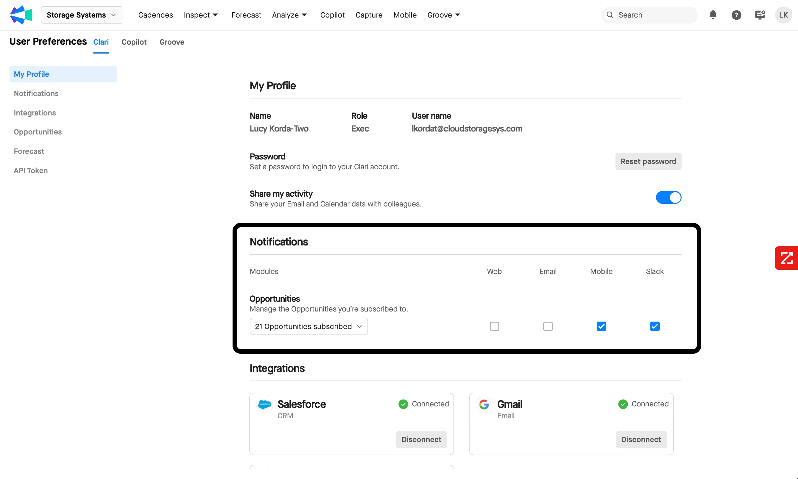 In Clari > Preferences > Noticiations, you can then select through which channels (e.g., web, email, mobile, Slack) you’d like to receive these notifications.