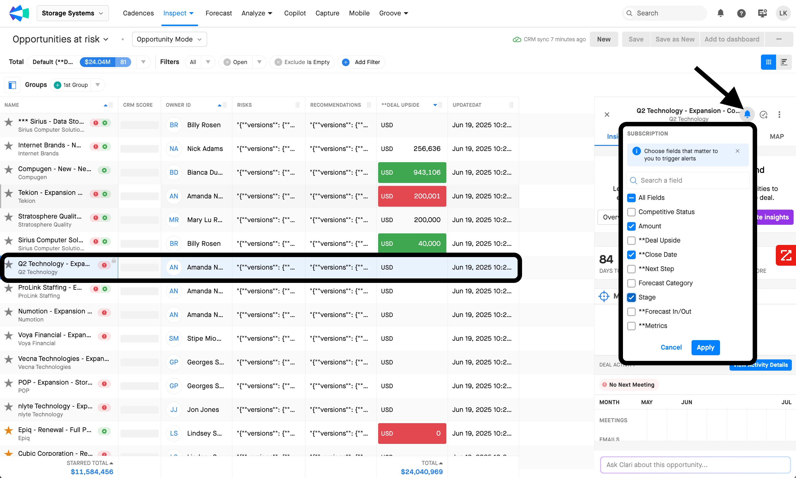 Opportunity field notifications are available to all Clari Core users. When you click on an Opportunity in Clari, you can then click on the ‘bell’ icon in the Inspect panel to select for which fields you’d like to be notified whenever a change in value occurs. These notifications will help you track specific updates to Opportunities in real time. For managers, this functionality can be especially helpful for ensuring you always know the state of your business.
