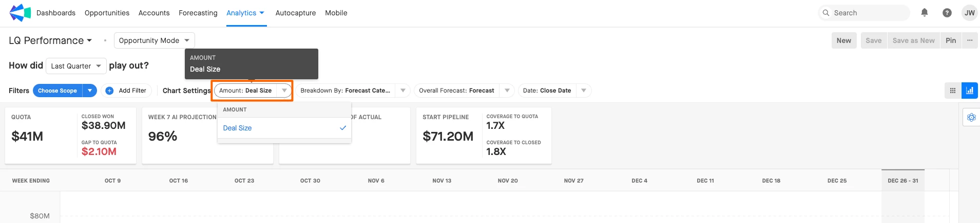 When you checkmark this option for the intended field(s) in the Field Config Layouts page, this means that the selected field will appear as a dropdown option for the Amount Chart Setting. As a refresher, the selections in these dropdown determine which amount fields are used to roll up the numbers you look at in Analytics.
