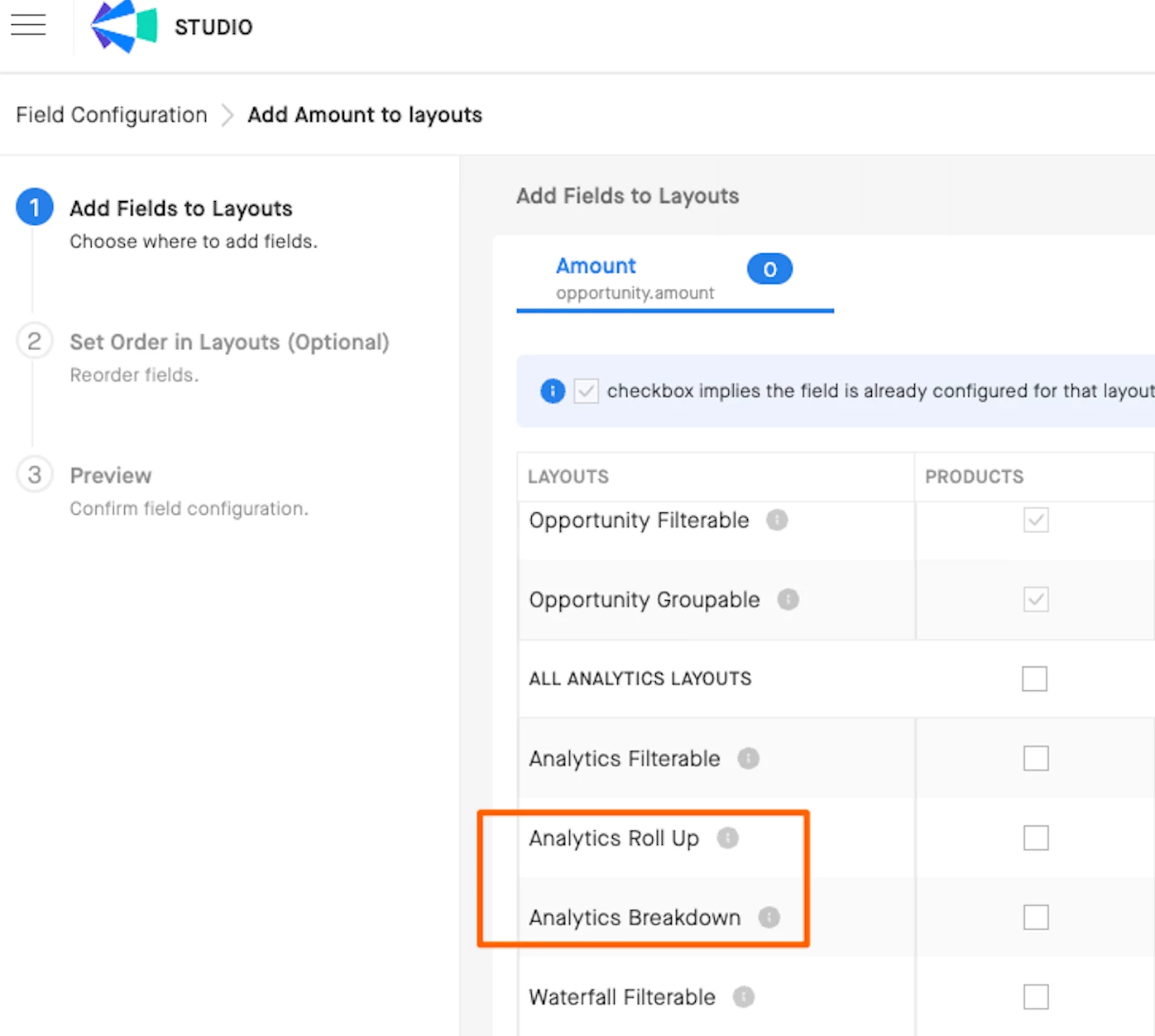 Tip: To add a field to Analytics Rollup, it must first be added to Opportunity Grid. Only Currency or Number fields can be added to this layout.