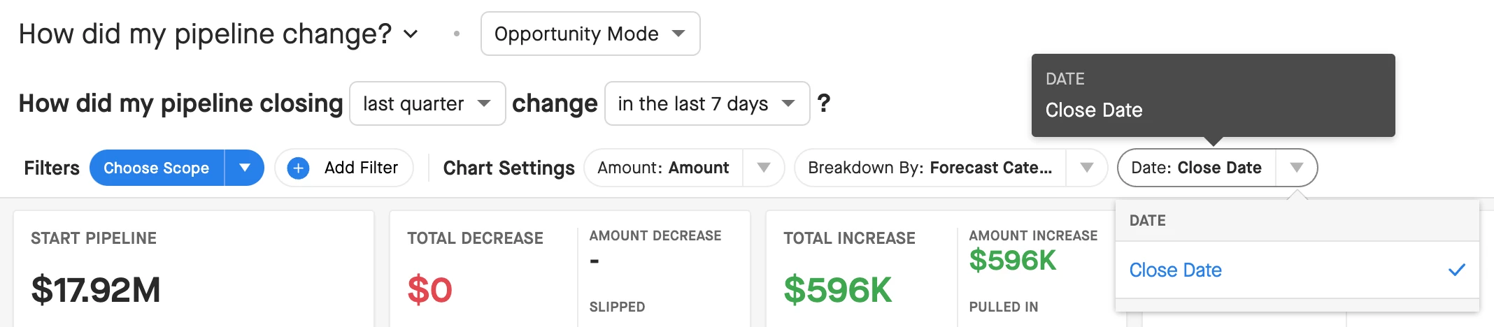 Hi Kenna - yes I am very much aware of the field configuration and that I can add different dates into the Clari analytics.  I was calling out the new Time Machine feature for the actual date changes for each bucket shown in the right panel.  It shows Close Date - standard right now - although this will be showing whatever we setup like Start date or Booking date, but it still is represented on the Waterfall - Time Machine as Close Date.  I was referring to be able to change the name of this field shown.