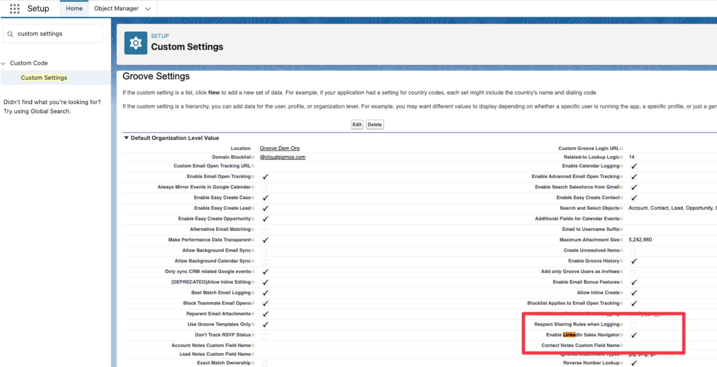 The good news is that you don’t need to raise a support case for this. Admins can easily disable the LinkedIn Sales Navigator tab directly from the Groove Custom Settings in Salesforce.