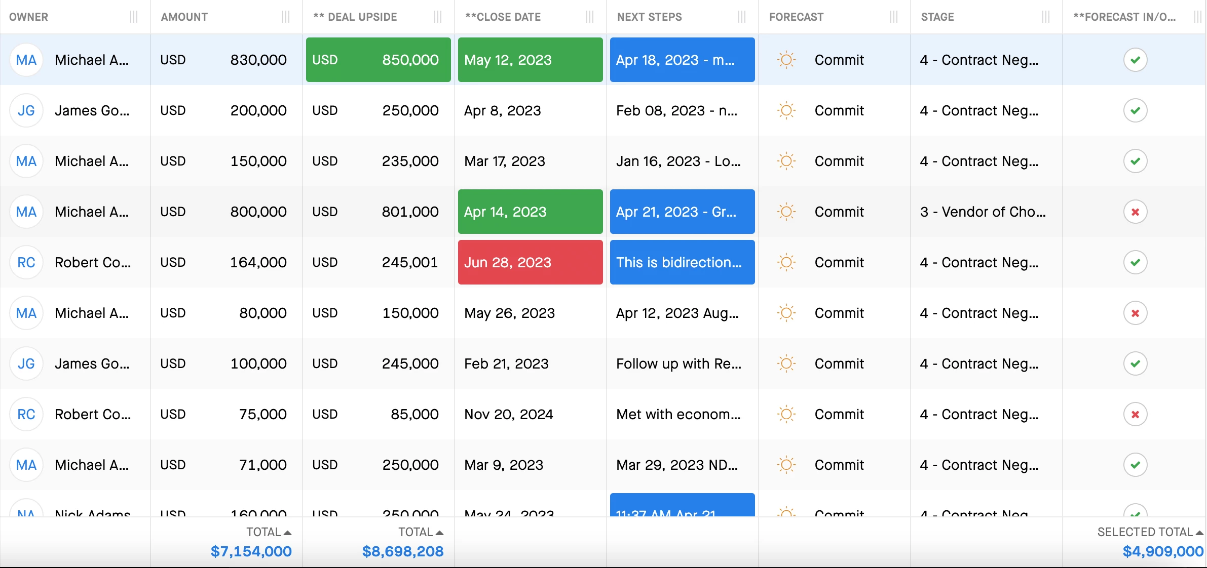 This helps team to be efficient because they can simply double click on these fields to update them whenever necessary. What’s more, Clari will highlight history-tracked fields that have been updated recently in red, green, or blue depending on if the update represents a positive, negative, or neutral update to the deal. Clari’s integration with Salesforce is bi-directional, so recently updated fields will be highlighted in the Opportunity Grid whether they were updated in Clari or in Salesforce.