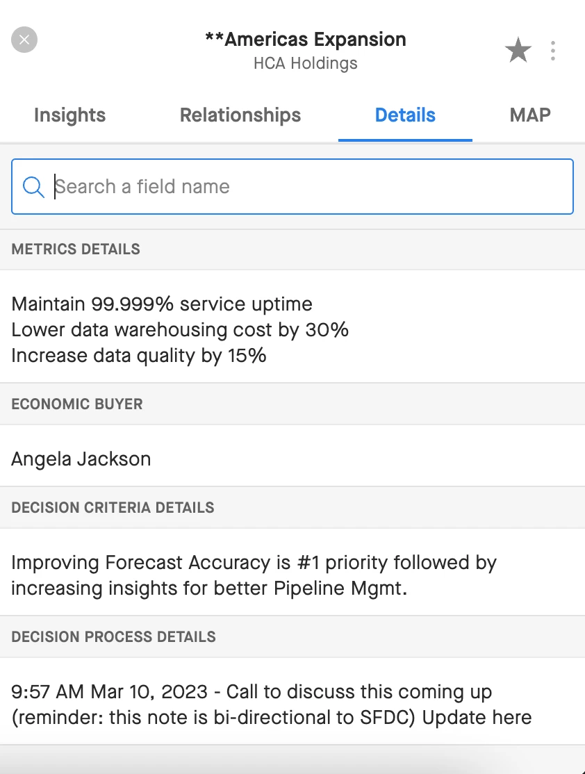 This helps keep your sales team connected because when folks inspect deals, you can review the sales methodology as it relates to the deal and your next steps side by side while still being able to see critical information like Close Date and Stage.