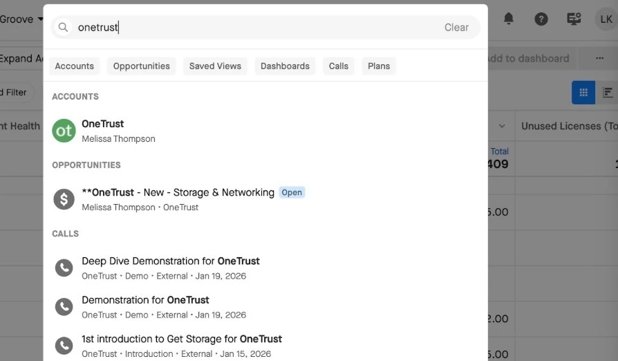 Improved Search: We’ve improved search to include faster search results and more details like deal stage and account owner when searching deals. You’ll be able to search across everything Clari and select search facets like Accounts, Views, or Calls to quickly filter your results. Learn More
