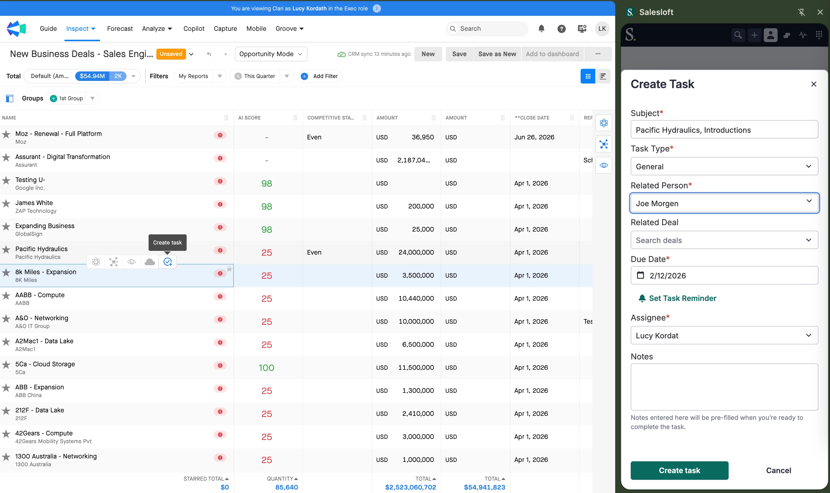 When inspecting your pipeline, spot risk and create tasks that will surface in Salesloft Rhythm. Click the task icon from the Opportunity list view (in the right panel or in Relationships) to populate the task with the Opportunity and/or Contact. Then save it directly to Salesloft without leaving Clari.