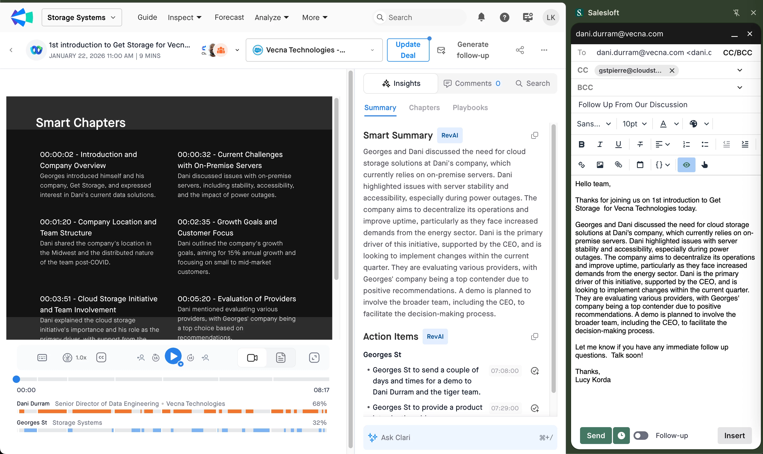 Send Salesloft-tracked follow-up emails in one click. Once your call summary is generated, click to populate it directly into a Salesloft email with a subject line and all call participants. Help Center: Copilot AI Follow up Email