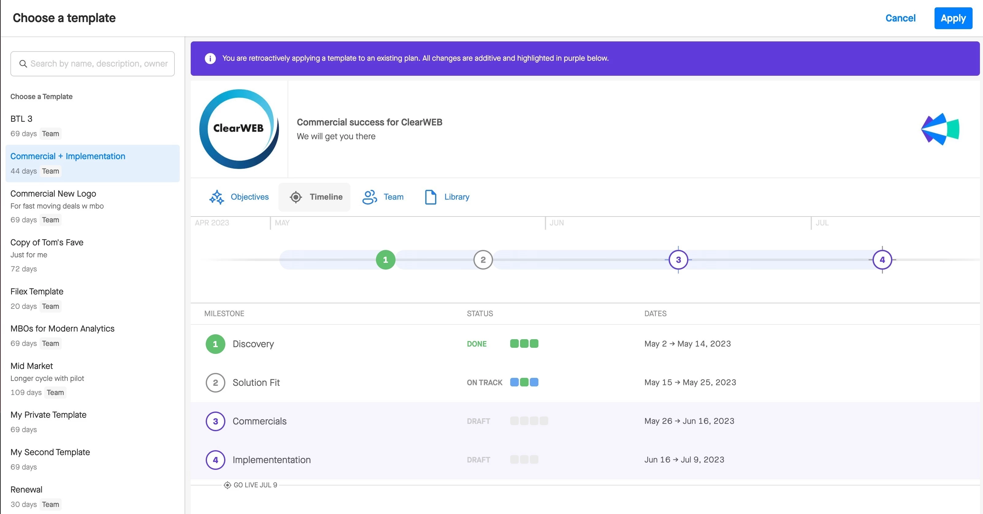 Users can now add templates incrementally to existing milestones as they gain a better understanding of a buyer’s purchasing process. You can create a milestone on your own, and then add a template later without being burdened with upfront decision-making and workload. See examples of how to use Modular Templates here.