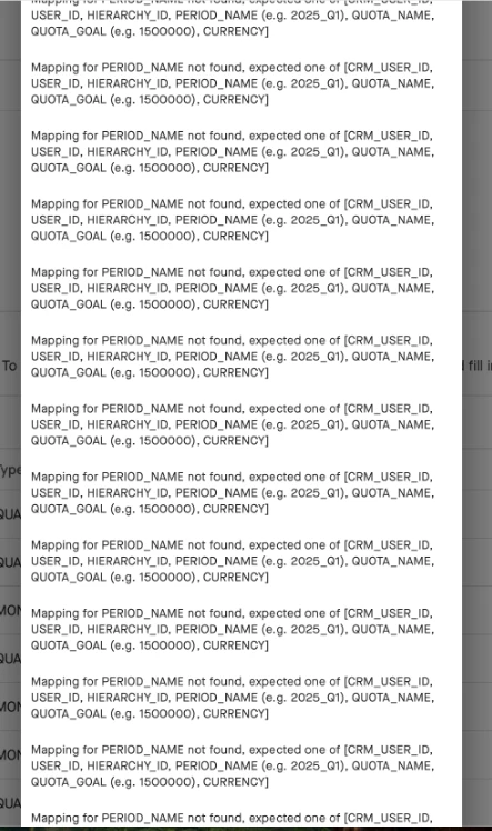 My first suggestion would be to ensure that the period name in your CSV file follows the correct format. It should typically be in the format of YYYY_Q1 for quarterly periods or YYYY_M1 for monthly periods. However, I understand that you already checked the formatting in the troubleshooting you have done so far.